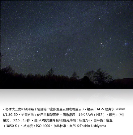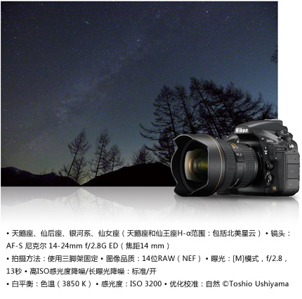 广角镜头有助于顺利地捕捉动态星空景象。配合使用D810A等高像素数码单反相机,放大拍摄图时能清晰地确认星云、星团和星系图像。探索并体验天文摄影的乐趣吧。