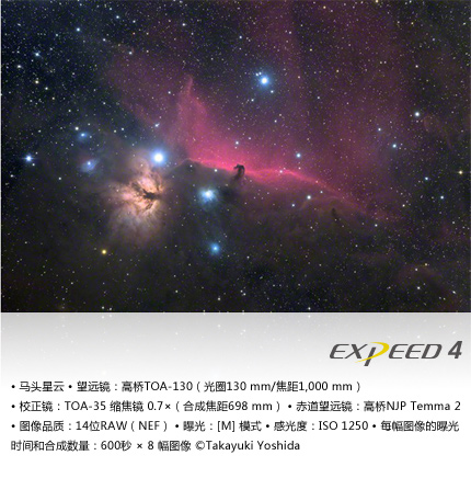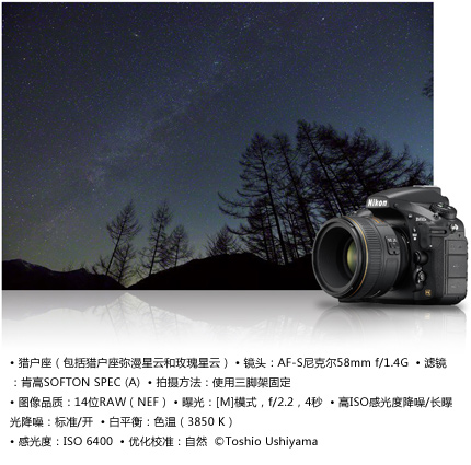D810A轻松应对了这个难题。明亮星体周边的鬼影大幅减轻,因而省去了后期图像处理的繁琐过程。如果在大型显示屏上浏览刚拍好的图像,便能欣赏到星云的丰富色调,而且照片内含的丰富数据对图像后处理大有帮助。此外,约3635万像素尽情捕捉黑暗中的细腻点滴。D810A为我开拓了崭新机遇,将马头星云的美丽色彩和高分辨率图像的辉煌展现地淋漓尽致。 我无需担心如何将明亮的星体纳入同一幅图像中,眼中所见宇宙的浩瀚奇观,再现于照片之上,而且色彩过渡丰富,达到惊人的效果。”