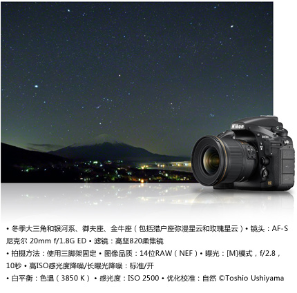 要充分发挥高像素影像传感器的潜力,必须配合使用尼克尔镜头,才能获得相匹配的分辨率。尼克尔镜头是世界各地的天文摄影发烧友备受推崇的镜头,使用该系列镜头也是D810A的优势之一。