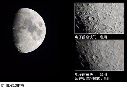 启用电子前帘(仅Mup模式中可选)替代机械前帘快门后,照相机的影像传感器可充当焦平面快门的前帘(必须设置为自定义)。消除了传统机械快门前帘的移动及反光板弹起拍摄时的机械震动。同时消除了反光板移动产生的震动。产生的震动小,因此建议用作天文摄影,尤其用于拍摄月球表面。