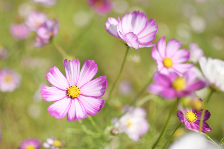 大波斯菊的粉色与天空的蓝色结合在一起,构成了一枚可爱的淡彩系列照片。正好云朵也好似棉花糖一样轻轻漂浮着。太阳的光芒透过,使花瓣呈现半透明的效果,这也是一个拍摄的要点(示例照片3)。