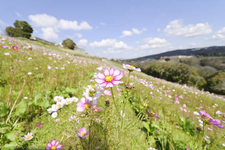 您可进入大波斯菊的斜坡花田近距离观赏花朵,但在拍摄时请注意文明礼仪。