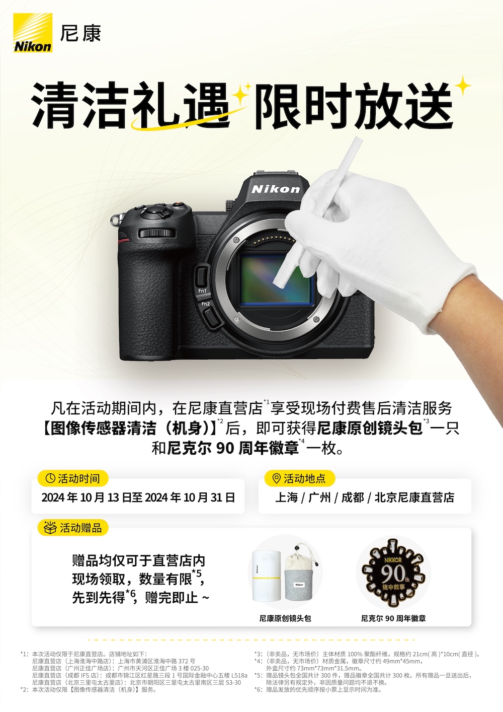 清洁服务推广期间,为了回馈广大用户的支持,尼康直营店还推出了清洁有礼活动。凡在2024年10月13日至2024年10月31日活动期间内,在上海/广州/成都/北京尼康直营店享受【图像传感器清洁(机身)】服务(费用120元),即可获得尼康限量周边:尼康原创镜头包一只和尼克尔90周年徽章一枚,送完即止。