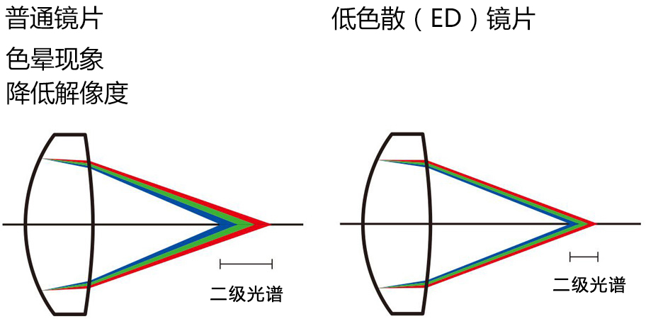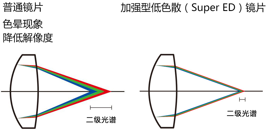 采用加强型低色散(Super ED)镜片的镜头是在部分尼康单反相机上作为更换镜头而使用的镜头。通过有效发挥低色散(ED)镜片的光学性能,不仅是在色散(色差)补偿方面,在多种像差补偿方面都表现优秀。