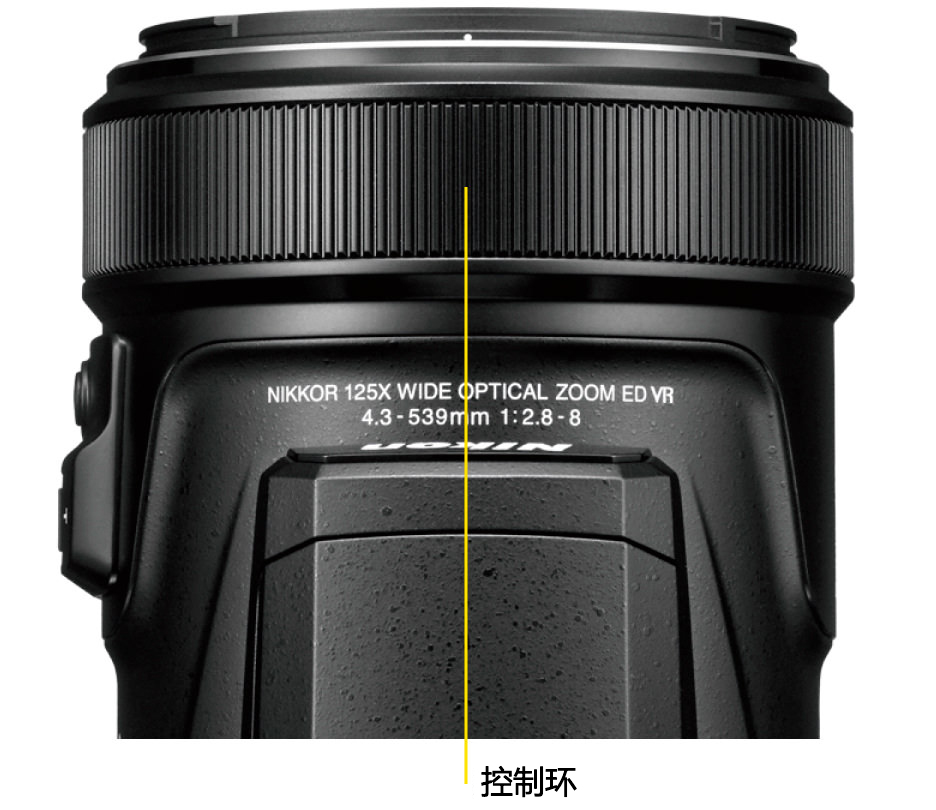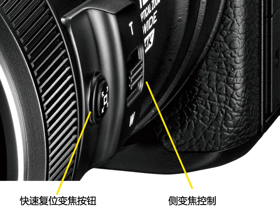 侧变焦控制杆配置在镜筒的左侧。左手握住镜筒的同时,能够实现流畅的变焦操作。此外,如果在菜单上将侧变焦控制设定为手动变焦(MF),并且变焦模式设定为手动变焦(MF)时,可以用它来进行手动对焦。