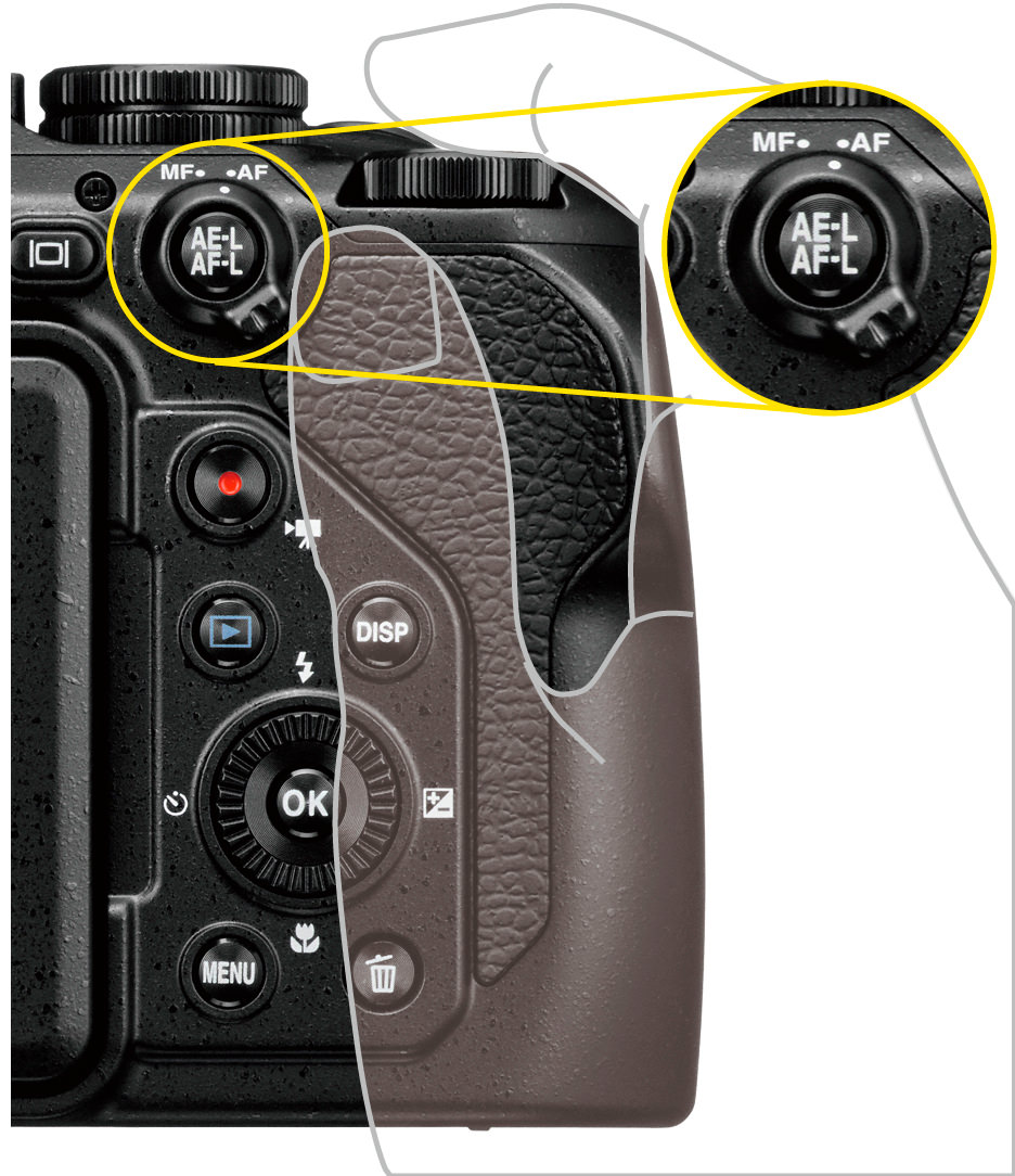握持相机时只需稍微移动右手大拇指即可快速切换对焦模式(AF / MF)。