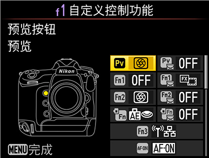 由于D5现在对静止图像拍摄和动画录制分别采用单独的“自定义控制指定”屏幕,易于指定自定义按钮的功能,例如Pv和Fn1按钮。同时可以自定义Fn2和Fn3按钮。