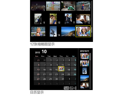 带变焦播放的全画面和缩略图(4、12、80 画面或日历)播放模式、动画播放、照片及/或动画幻灯播放、直方图显示、高光、自动旋转图像、照片评分、图像注释(约36 个字符)