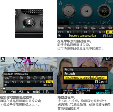 - 内置Wi-Fi®与智能设备连接,分享好照片。并可通过 Wi-Fi® 遥控拍摄。