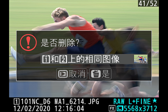 当在2个卡槽中以“RAW和JPEG”或“JPEG和JPEG”记录了相同的图像,或者在“备份记录”记录了相同的副本时,D6允许您通过一次操作同时删除2张图像,从而提高了效率。如果图像带有语音备忘录,则可以选择仅删除备忘录,也可以选择删除图像。