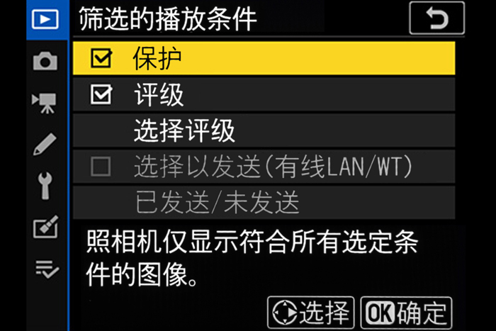 当查看照片的时间有限时,快速访问重要的图像就很有意义。D6的i菜单提供筛选播放选项,仅显示满足某些条件的图像:受保护,已打分,已发送和未发送。您还可以在全屏播放期间通过旋转副指令拨盘来设置逐帧播放已打分图像,以及受保护的图像、照片、视频文件夹和10或50帧跳转等现有选项。