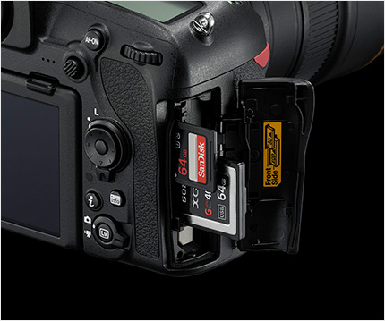 可靠的存储介质是创造性工作的关键。D850 配备 XQD 卡和UHS-II SD 卡双插槽,支持快速读写来自高像素影像处理器的大量数据。它还提供多种存储选项,包括将相同的数据存储到两张卡上进行即时备份,或者将 RAW 文件和 JPEG 文件同时记录到不同的卡上。