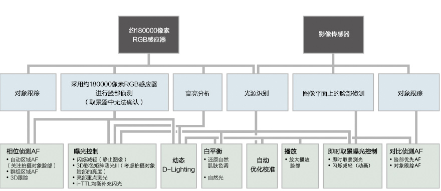 D850采用约180000像素RGB感应器。场景识别系统利用RBG感应器的高像素数来提升多种自动控制的精度,比如矩阵测光、自动白平衡、i-TTL均衡补充闪光、自动区域自动对焦(AF)、3D跟踪和动态D-Lighting。此外,得益于感应器的低对比度灵敏度,测光范围低至-3EV*,适用于拍摄低光照场景或使用增距镜拍摄。同时,闪烁侦测功能减轻闪烁的影响,实现均匀的静止图像拍摄。