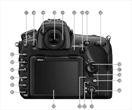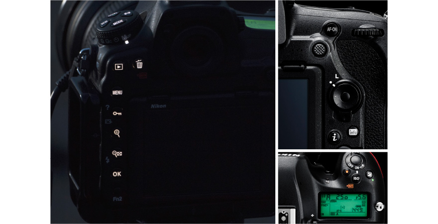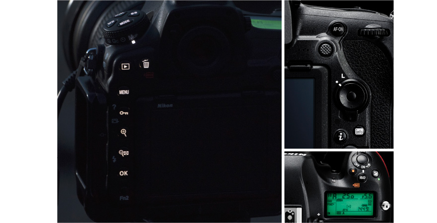 照相机背面的左侧按钮以及释放模式拨盘提供背光,在昏暗环境中拍摄时便于更改设定。此外,按钮和拨盘的布局符合人体工程学设计,便于摄影师操作。机身背面增加了副选择器,方便操作。