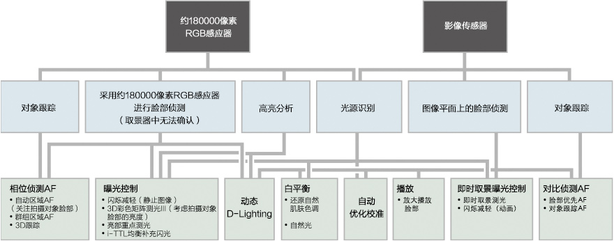 * 在尼康测试环境下:ISO 100, f/1.4镜头, 20°C,使用矩阵或中央重点测光。