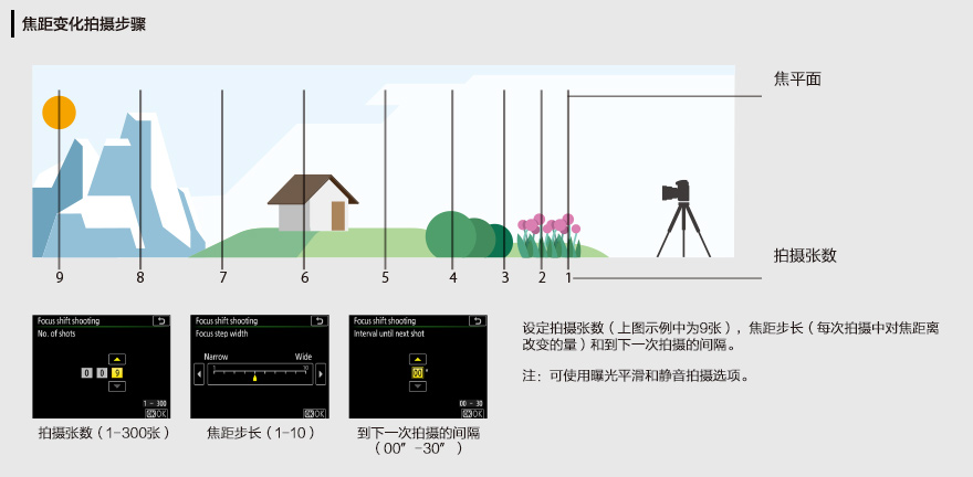 当拍摄含有不同对焦距离的多个拍摄对象或者制作昆虫或花朵的标本图片时,摄影师可能希望让每一个对象都锐利对焦。 D850 导入了焦距变化拍摄功能,可拍摄多达约 300 幅的一系列图像,同时从起始点到无限远逐渐自动移动对焦位置。快门释放间隔可设定为 0-30 秒,焦距步长可选择 10 个等级。而且还提供约 5 幅 / 秒连拍。后期处理 * 时使用景深合成将照片结合起来,便能获得一幅前后细节都锐利对焦的图像。