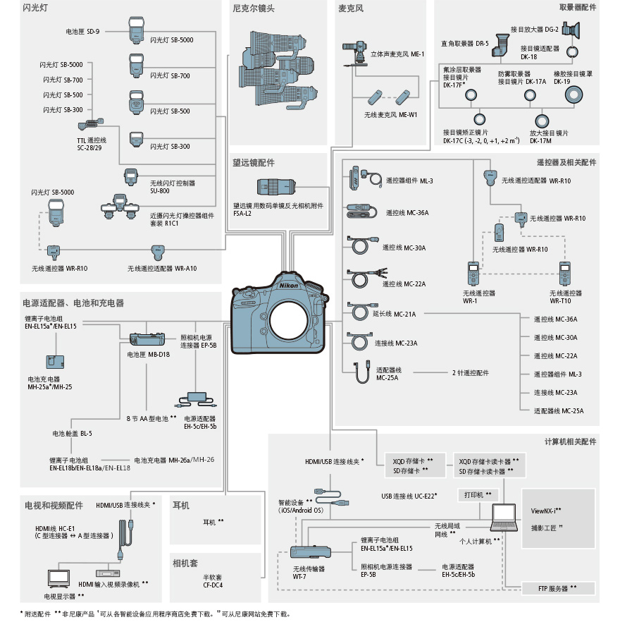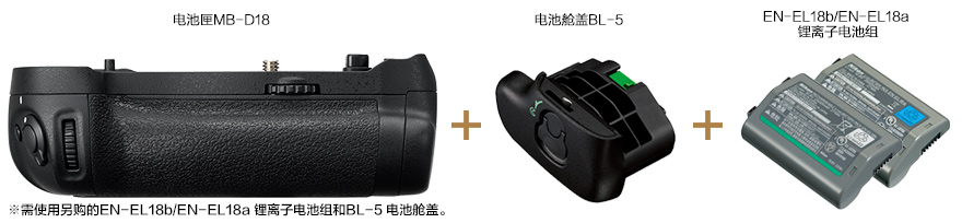 当使用EN-EL18c/EN-EL18b/EN-EL18a/EN-EL18*电池时需搭配另购的电池舱盖BL-5和电池充电器MH-26a/MH-26。