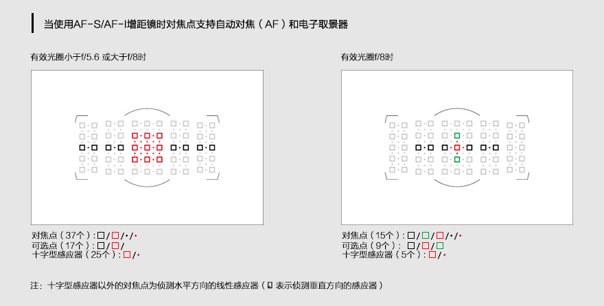 即使使用增距镜时,D850也展示强大的自动对焦(AF)性能。所有的153个对焦点兼容f/5.6或更大的有效光圈。包括9个可选点在内的15个对焦点兼容有效光圈f/8。