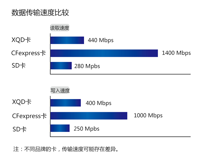 *当在“高速连拍(延长)”模式下使用12位RAW、JPEG或TIFF时。具有自动对焦(AF)和自动曝光(AE)的约12幅/秒连拍在12位RAW格式时持续拍摄约3秒。约5.5幅/秒的高速连拍在拍摄期间几乎能够实时显示拍摄对象的动作。连拍速度取决于图像品质、图像尺寸和静音拍摄设置以及所用存储卡的类型。