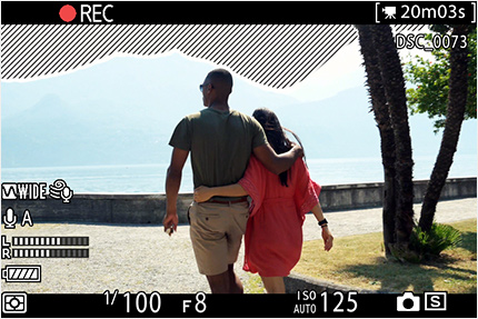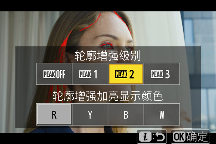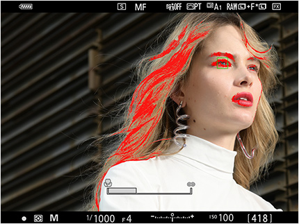 拍摄前,您可以通过按放大按钮放大图像以确认对焦。电子测距仪指示拍摄对象是否对焦,以及对焦点是否位于前方或后方。实现对焦时,所选对焦点变为绿色,从而更容易确认。同时,显示屏底部的对焦指示*显示在无穷远和最小范围之间获得焦点的位置。最后,当启用对焦轮廓显示时,相机会自动检测场景中对比度最高的边缘并以指定颜色突出显示。