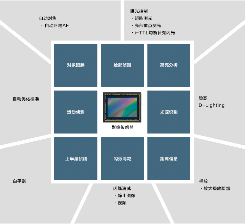 EXPEED 6影像处理器有助于发挥尼克尔Z卡口镜头和尼克尔F卡口镜头的高分辨率,以及相机的高像素影像传感器性能。它的设计旨在为影像带来高清晰度,同时有效降低噪点,使相机达到ISO 25600的感光度上限。