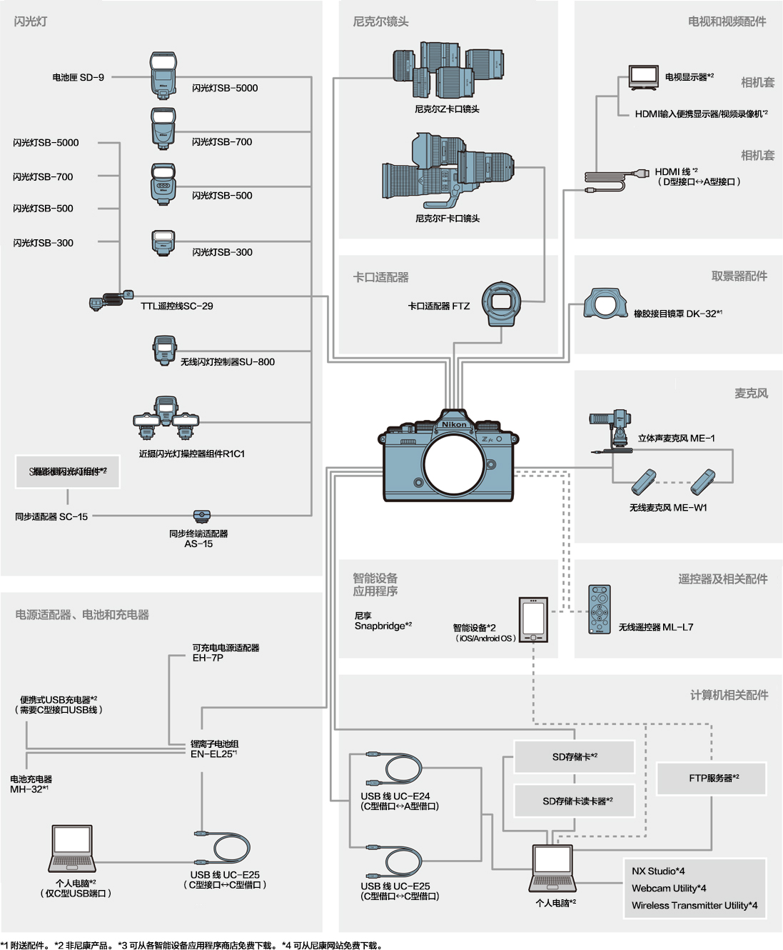 机身盖BF-N1、橡胶接目镜DK-32(与相机连接)、锂离子电池组EN-EL25、电池充电器MH-32、相机背带AN-DC23
