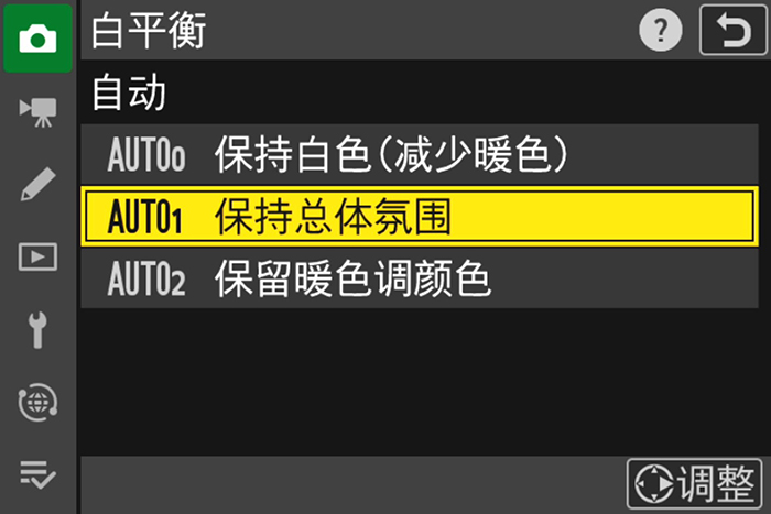 自动(3种类型)、自然光自动适应、晴天、阴天、背阴、白炽灯、荧光灯(3种类型)、闪光灯、选择色温(2500K-10000K)、手动预设(最多可保存6个值),均可进行微调