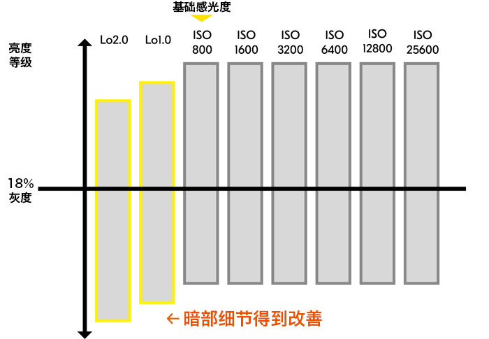 注:当色调模式选择 N-Log 时,ISO 感光度被限制为 Lo 0.3 至 2.0 和 800 至 51200。