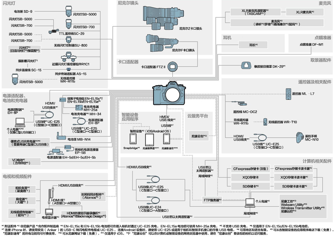*也可以使用EN-EL15b和EN-EL15a电池组来替代EN-EL15c。但是,与EN-EL15c相比,单次充电可拍摄的照片会少一些。EH-8P电源适配器仅可用于给EN-EL15c和EN-EL15b电池充电。