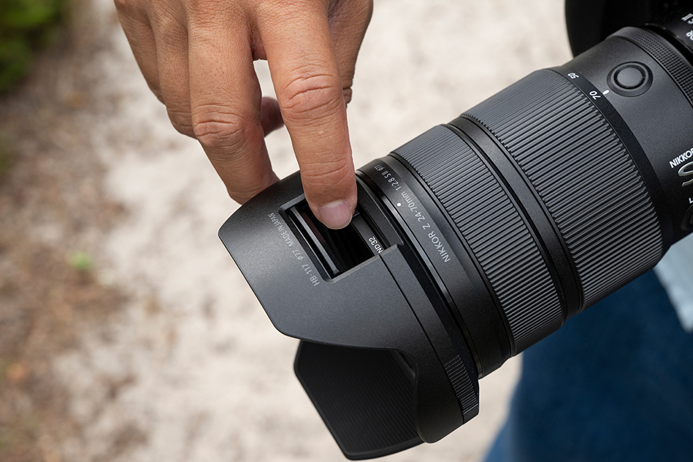 尼克尔 Z 24-70mm f/2.8 S II采用常见的77mm滤镜口径,支持安装多种滤镜。该口径与尼克尔Z 70-200mm f/2.8 S一致,不同镜头可共用滤镜。镜头遮光罩配备滤镜调节窗,方便调节减光滤镜及其他旋转滤镜,无需拆卸遮光罩。遮光罩可根据需求安装,调节窗可置于顶部或底部,灵活方便。