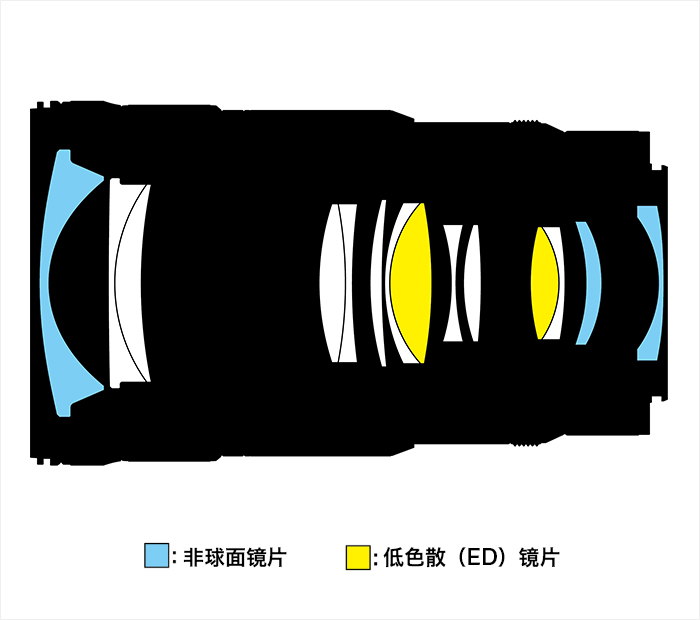 10组14片 (含2枚低色散ED镜片,3枚非球面镜片,具备中孔非晶态涂层和抗反射高清ARNEO涂层的镜片以及1枚氟涂层前镜片)