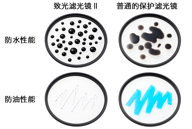 采用专为滤光镜开发的防水、防油镀膜。该涂层使水滴、油污和指纹等污垢不易附着,即使附着也能轻松擦拭,展现出优异的防污性能。该镀膜通过了在200g负荷下进行1000次以上的擦拭*,具备高耐久性。此外,玻璃的两面均施加了防水、防油镀膜,即使在复杂的拍摄环境中,也能安心地专注于拍摄。