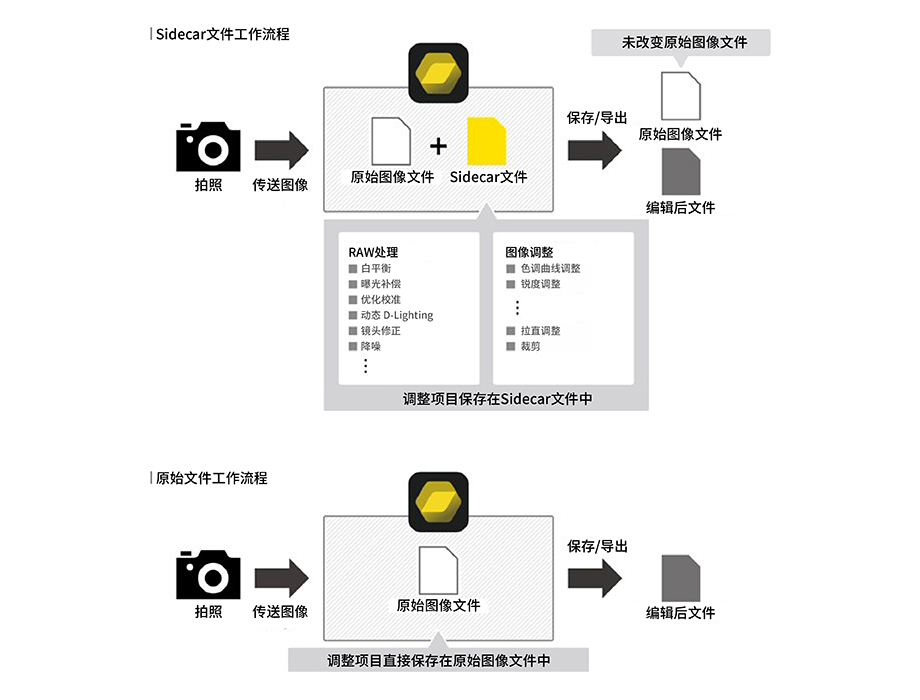 尼康工坊可以选择两种不同的格式来保存最终的后期编辑数据:”Sidecar”是将最终数据作为调整文件保存,命名为”sidecar文件”,”原始文件”是将最终数据直接写入原始文件,命名为RAW(NEF/NRW)文件。由于sidecar格式不会将任何调整数据写回到原始图像文件,因此可以保留文件的原始状态。如此,您就不需要等待将调整数据写回到大尺寸RAW图像文件的处理时间,从而提高了工作效率。另一方面,直接保存格式是将最终数据保存在一个文件中,因此,您可以轻松地使用Finder或Explorer等文件管理应用程序进行管理。