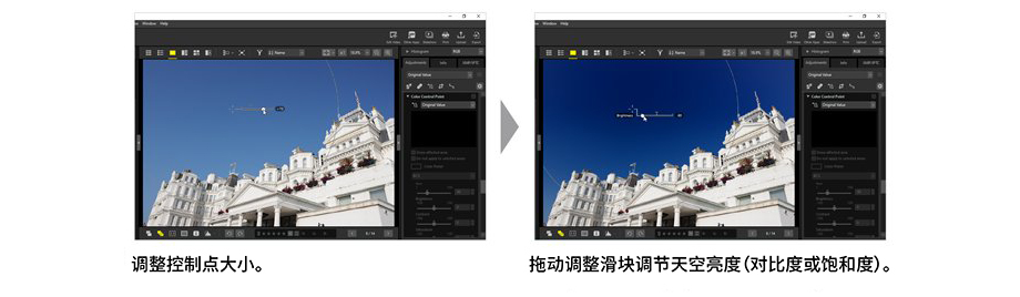 • 局部调节:用修饰刷去除图像中反射出的灰尘和其他小颗粒,使用彩色控制点来调整图像局部亮度和色彩