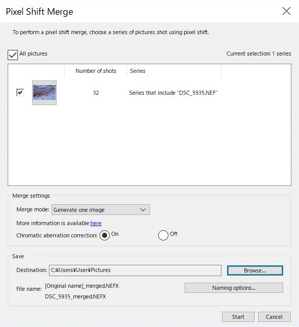 尼康工坊在工具栏中为像素移位拍摄功能*提供了合并功能,使用户能够以高分辨率生成图像,同时有效地减少莫尔条纹、假色和噪点。利用此选项,用户可以使用[像素移位合并]对话框设置来精细调整自己的图像融合偏好,例如选择合并图像的数量和校正色差。