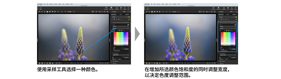 通过LCH编辑功能,您可以对图像中的任何颜色进行亮度、色度和色调的微调。由于软件会自动检测指定的颜色,因此即使您要调整的区域形状复杂或是在图像上随机定位的,您所做的调整也会立即应用到图像上。您还可以调整色度曲线的宽度来指定受影响颜色的范围。