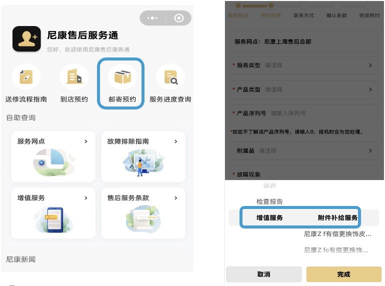 提前点击【邮寄预约】填写信息,在【服务类型】选择【增值服务】中【附件补给服务】,以便器材送达后我们更迅速地为您服务。